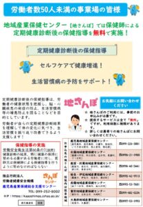 地域窓口(地域産業保健センター)のご利用について日頃より地域産業保健センターをご利用いただきありがとうございます。 地域産業保健センターでは、労働者 50 人未満の小規模事業場を対象に、労働安全衛生法に定められた健康診断結果に基づく医師からの意見聴取、保健指導などの産業保健サービスを無料で提供しております。 提供されるサービスは、国からの支援により運営されるもので、小規模事業場を優先し、いわゆる大企業の支店、営業所等は、基本的に支援対象に含めないこととしております。また、本事業は、事業場による自主的な産業保健活動の実施・定着を目的としており、継続的な支援を受けられるものではなく、新規事業場を優先的に支援すべきこととなっております。 |